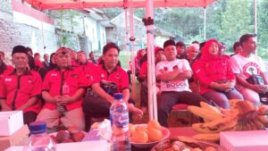 Suasana kegiatan semakin hangat dengan dominasi warna merah dari atribut partai yang dikenakan para kader dan simpatisan, mencerminkan semangat kebersamaan serta soliditas PDI Perjuangan di tingkat akar rumput.